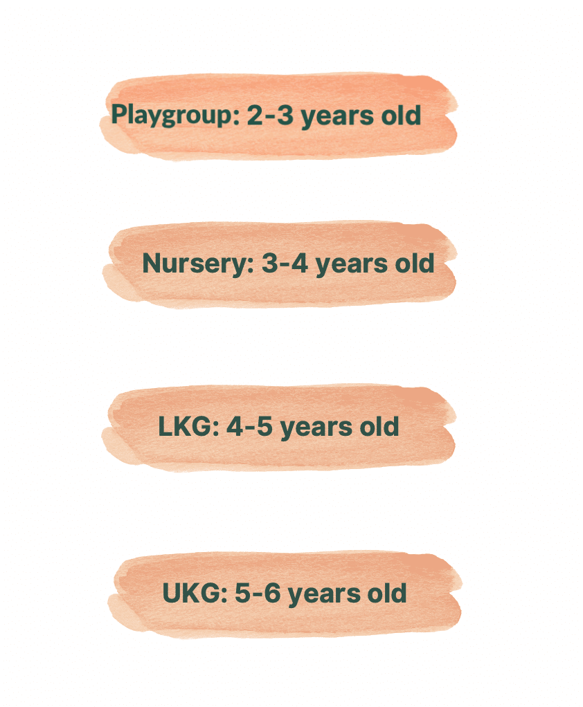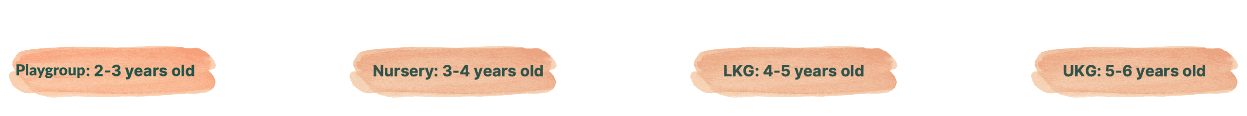 Children must complete 3 years for Nursery, 4 years for LKG and 5 years for UKG. We follow age-appropriate admissions giving importance to the complete, holistic developmental growth of children and unhurried learning.